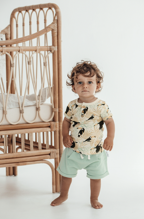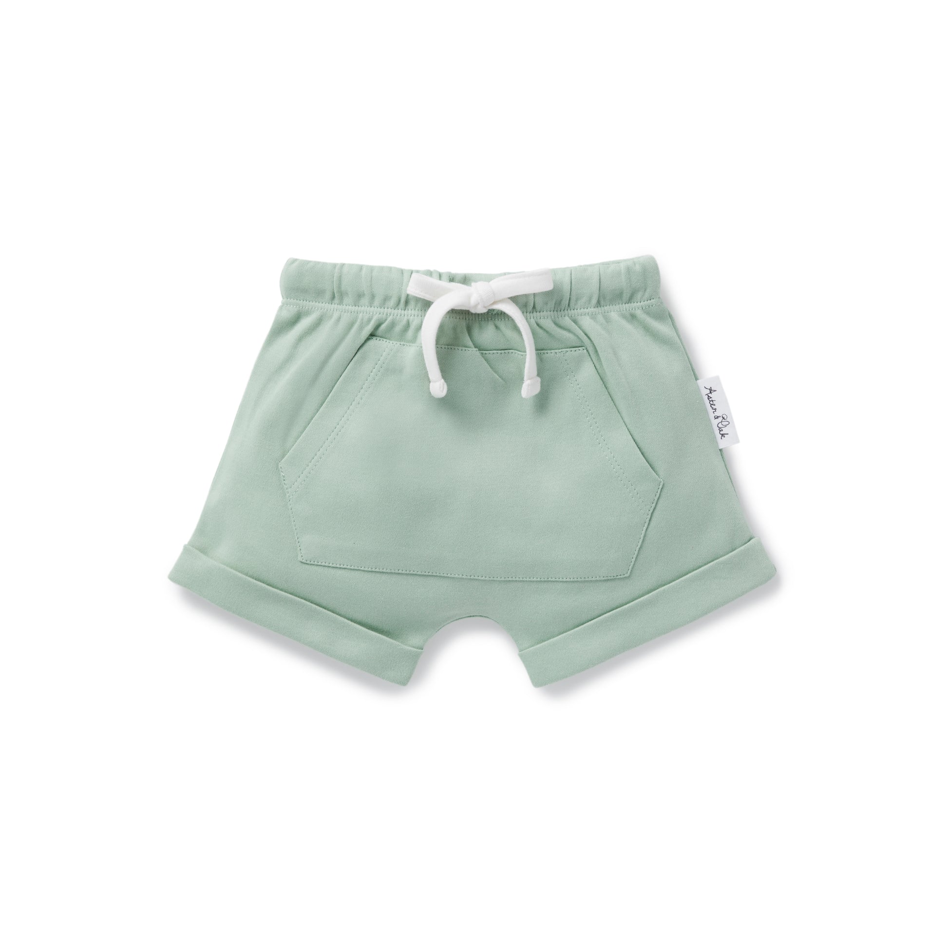 Made from GOTS certificated organic cotton. These plain shorts feature a soft elastic waistband with drawstring, rolled cuffs and kangaroo pocket and are harem style.