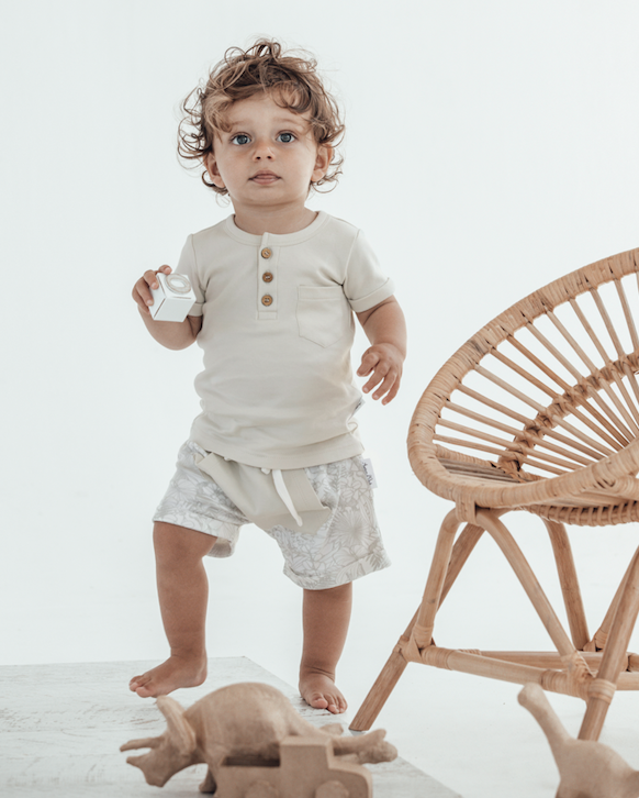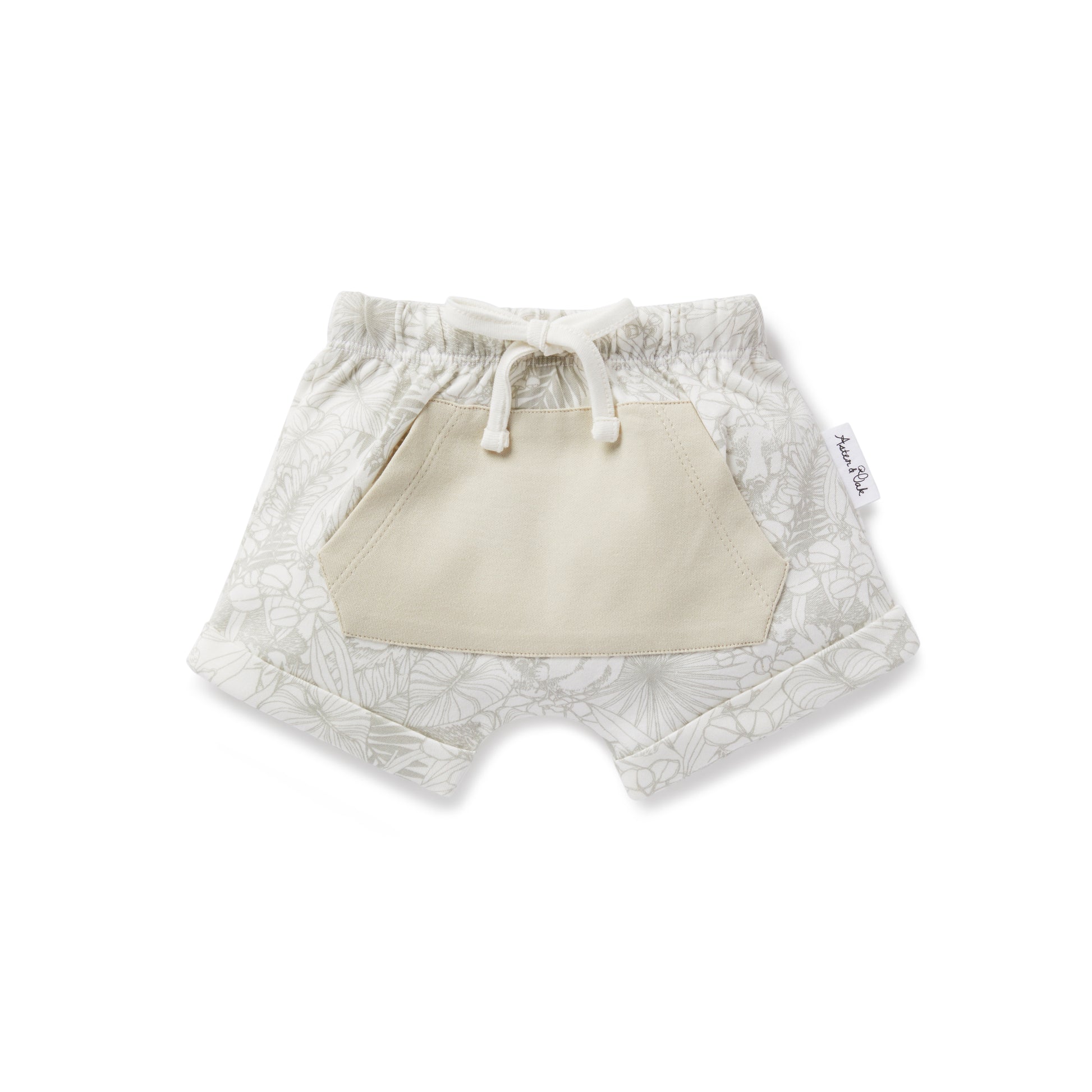 Made from GOTS certificated organic cotton. These shorts are hand-illustrated and feature a soft elastic waistband with drawstring, rolled cuffs and kangaroo pocket and are harem style.